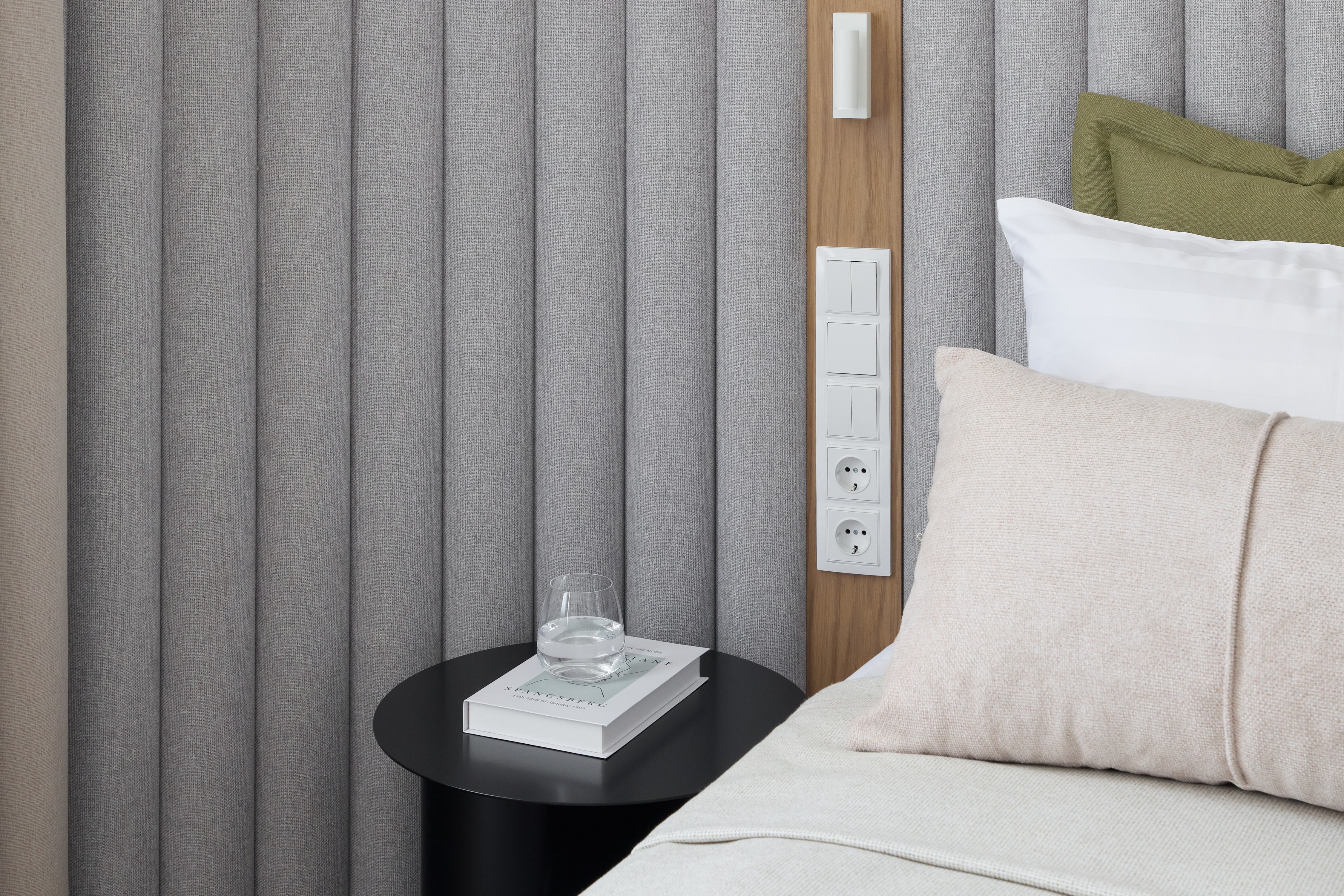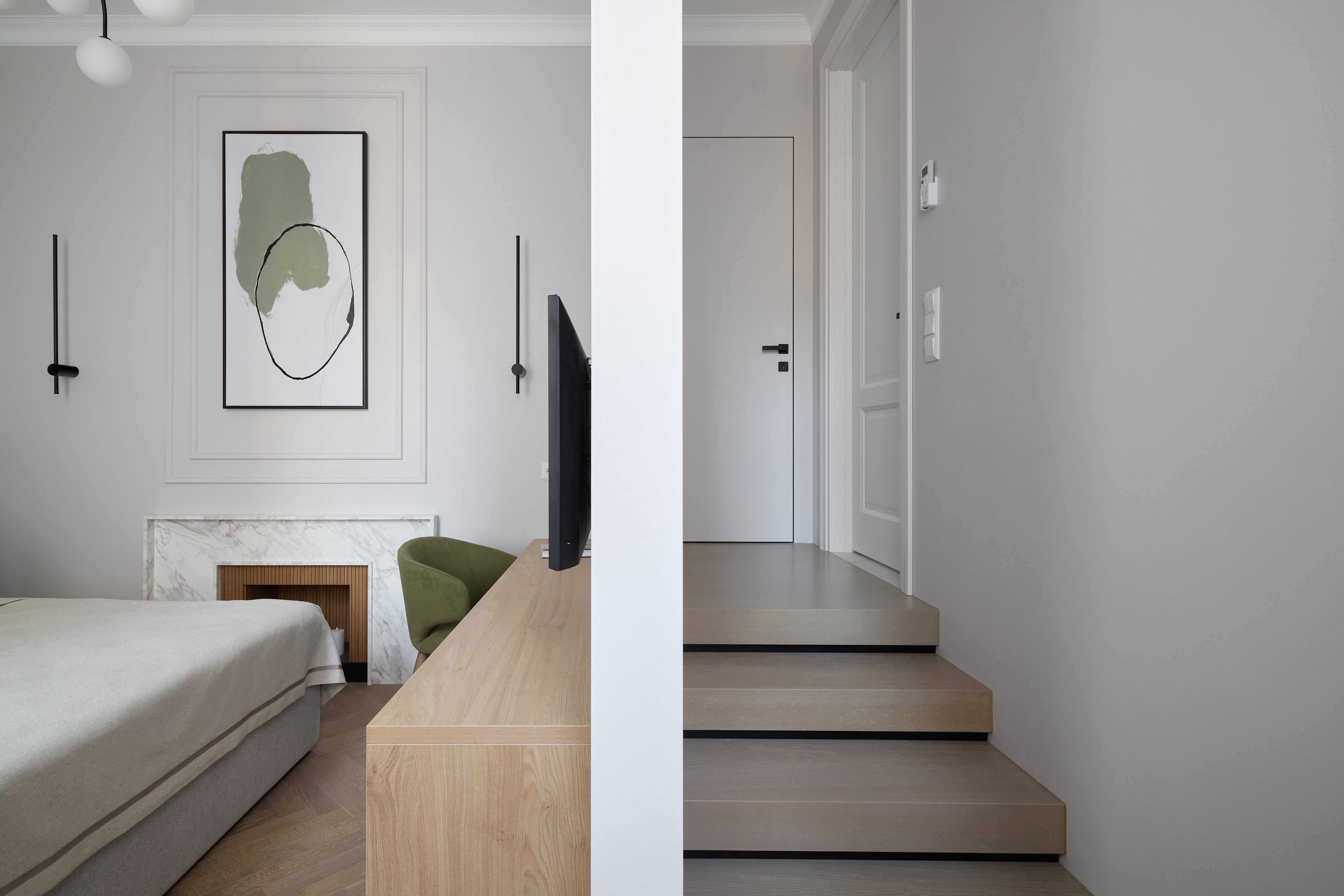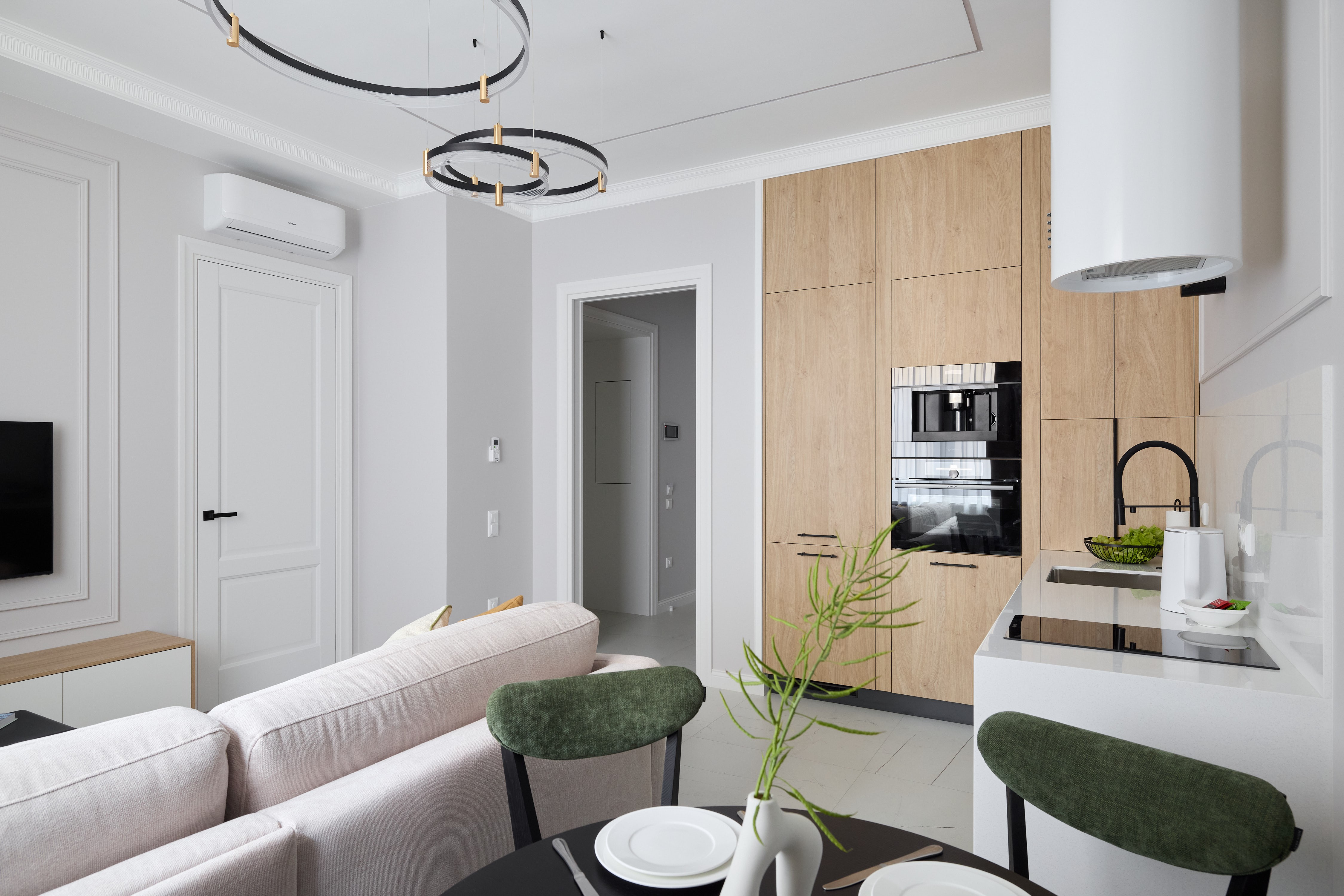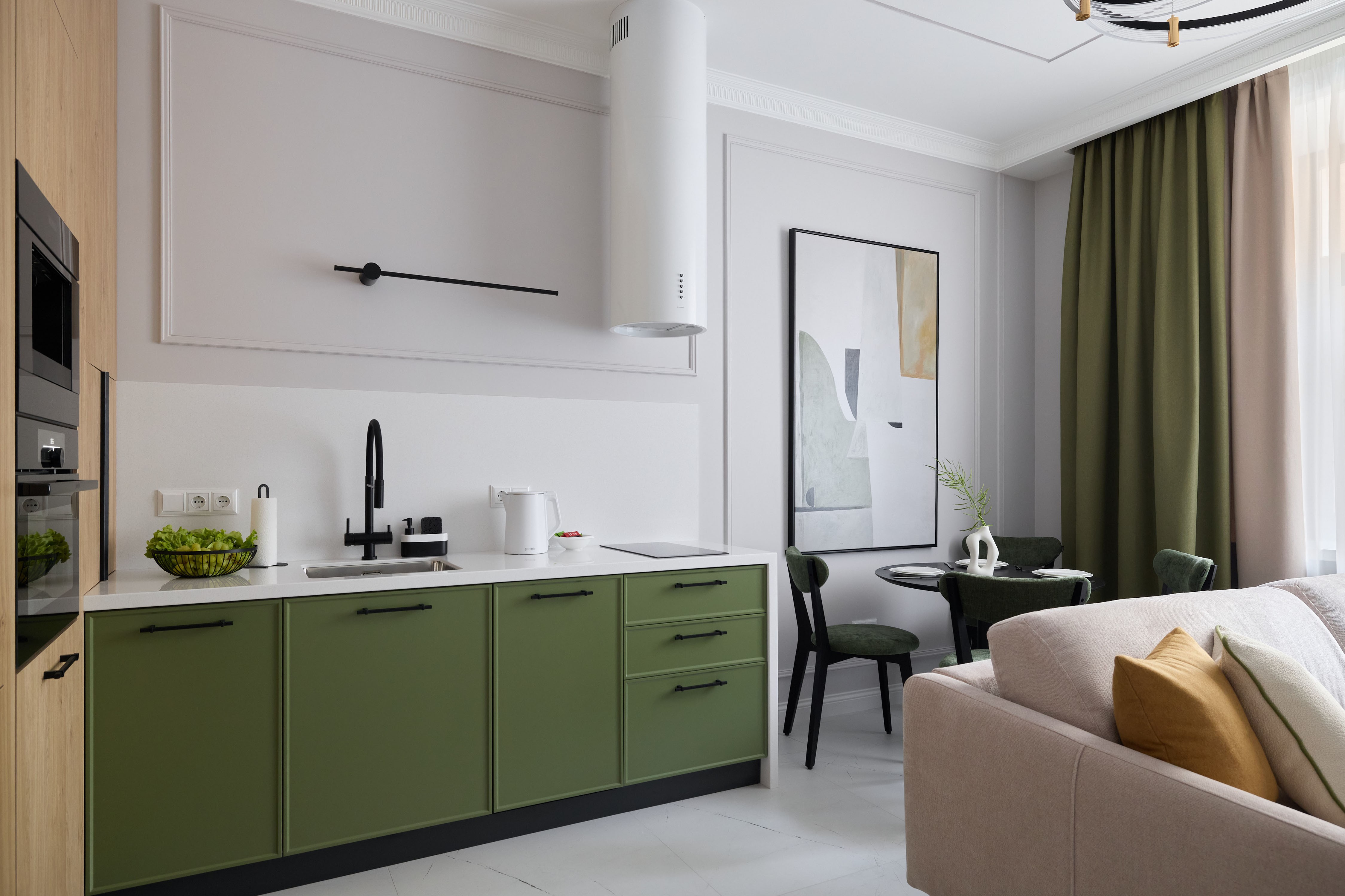 1-bedroom design apartment is located in the same building with our guest rooms. The apartment has 2 rooms with stylish living room combined with a kitchen and dining area and a bedroom with a double bed. This apartment is often booked by couples, families, as well as guests who prefer superior accommodation. There is a 24-hour security service near the entrance.