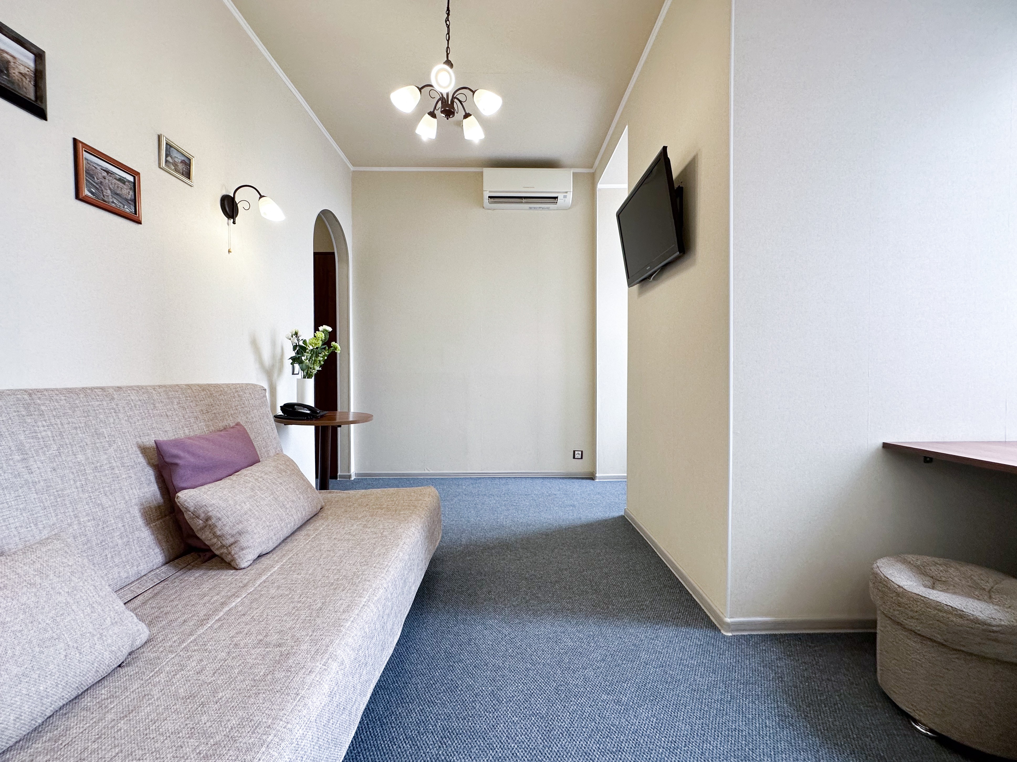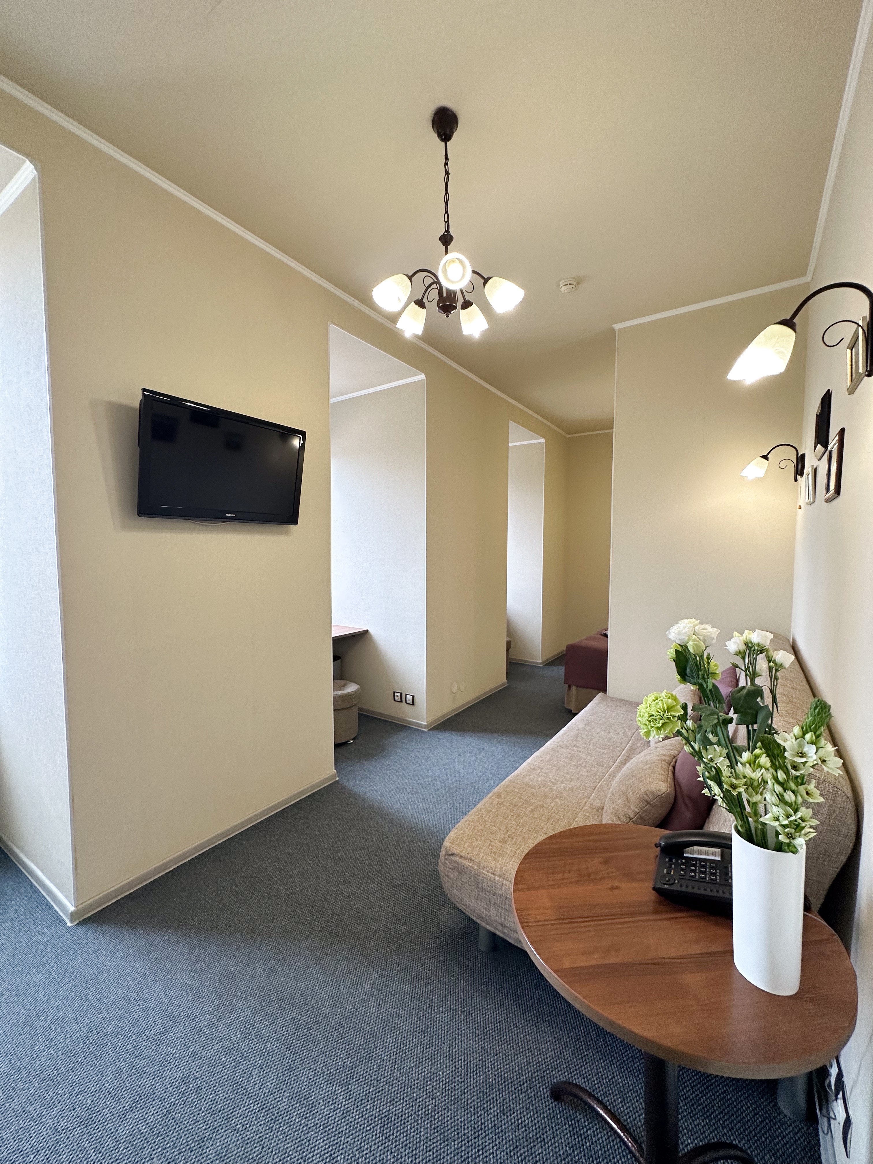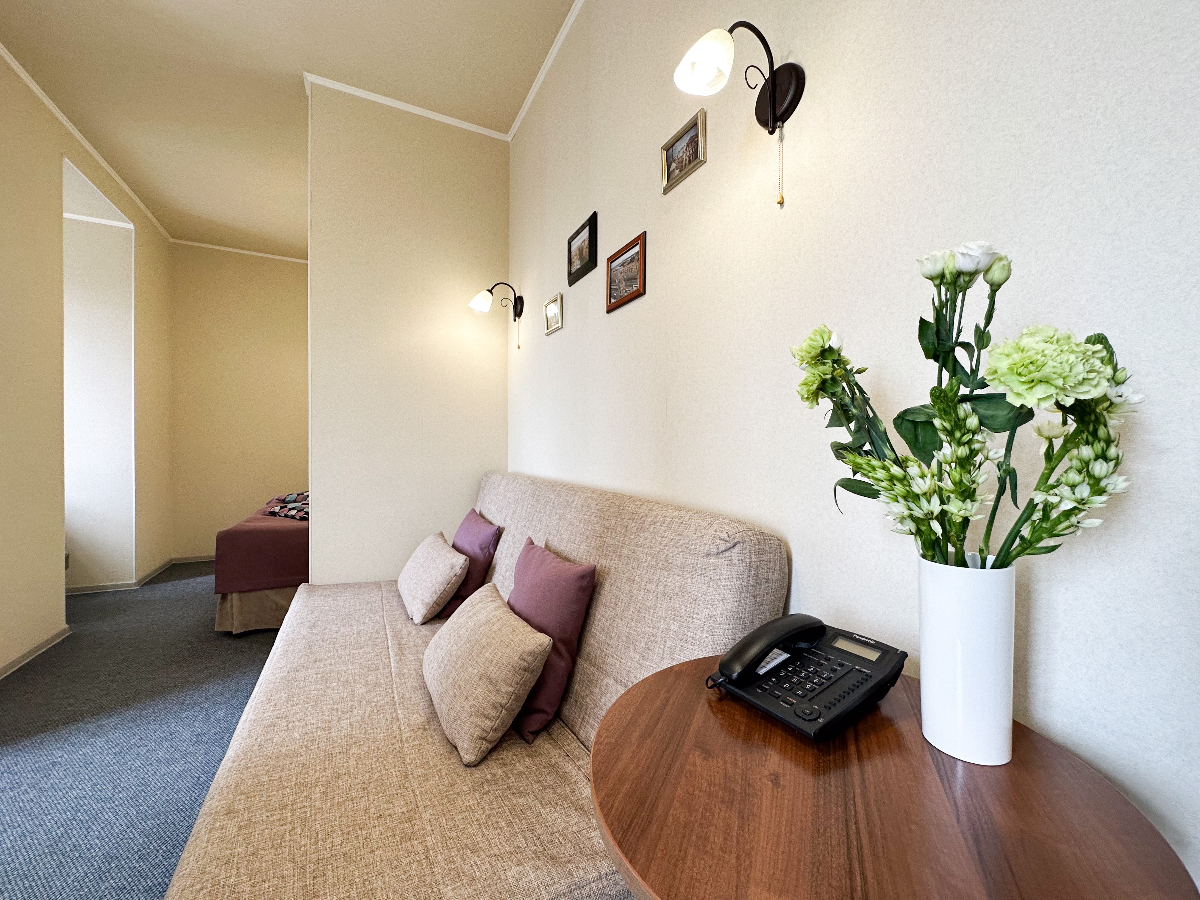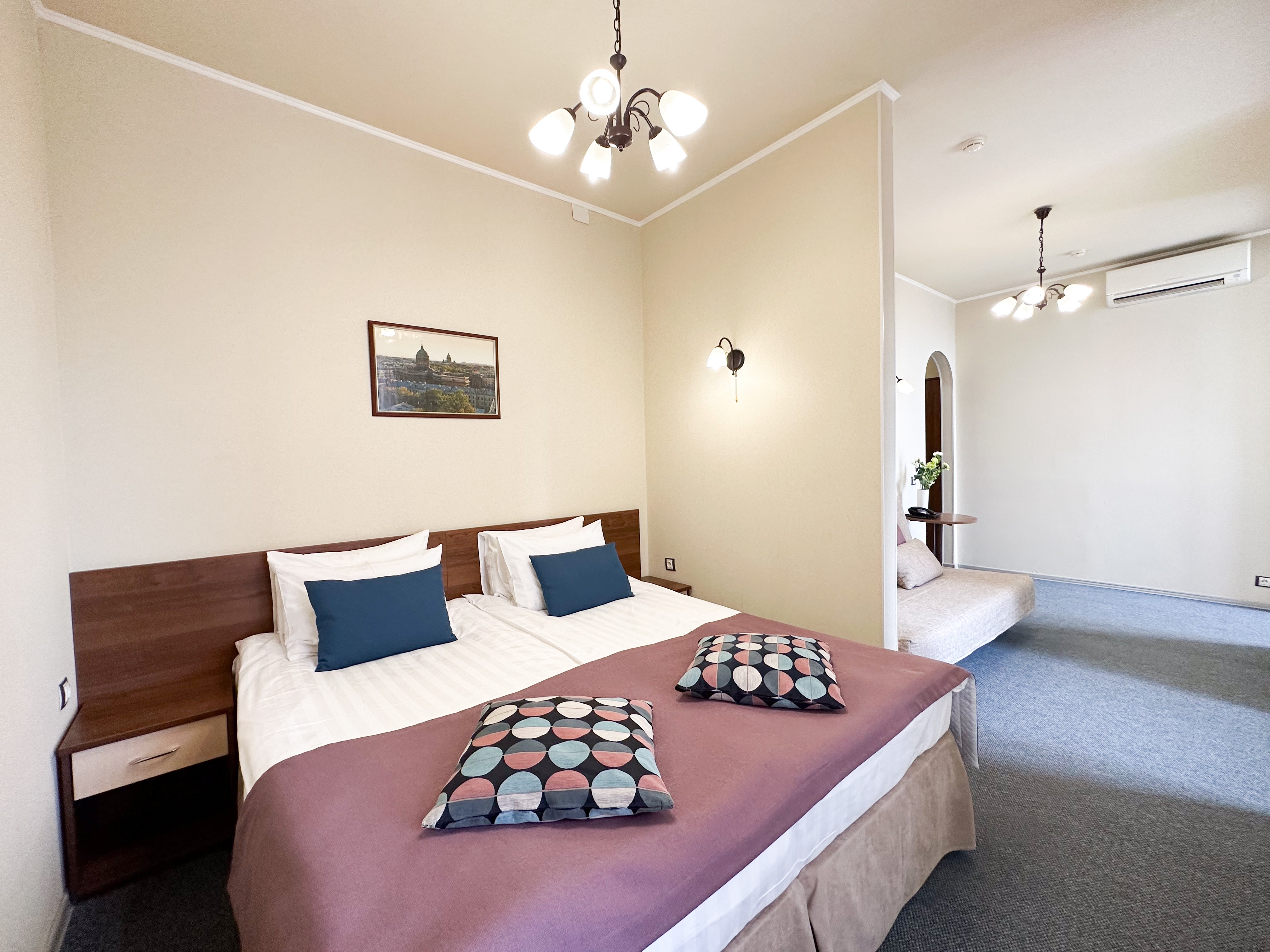 Family room is more spacious than junior suite room. Convertible sofa can be used as an extra bed for the 3d and 4th guest at extra charge. Hospitality tray is available for each guest.